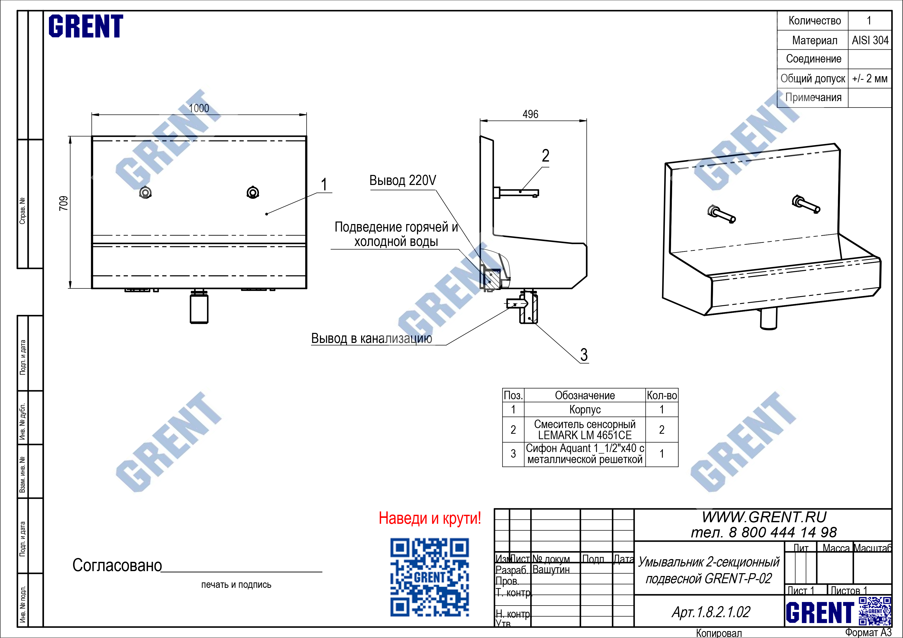 Двухсекционный умывальник GRENT-P-02 используется для бесконтактной мойки рук персонала преимущественно на предприятиях общепита и пищевой промышленности. Активация подачи воды осуществляться фотодатчиком при поднесении рук к смесителю.